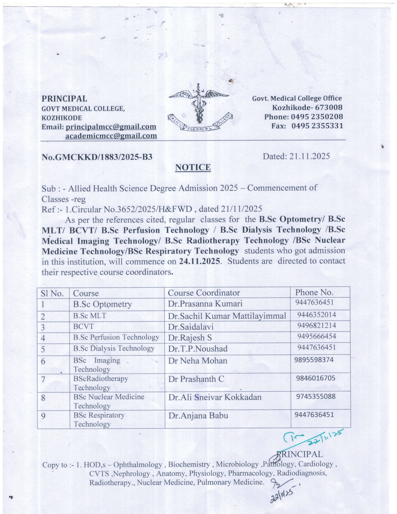 Allied Health Science -Degree admission 2025 - Notice for commencement of class