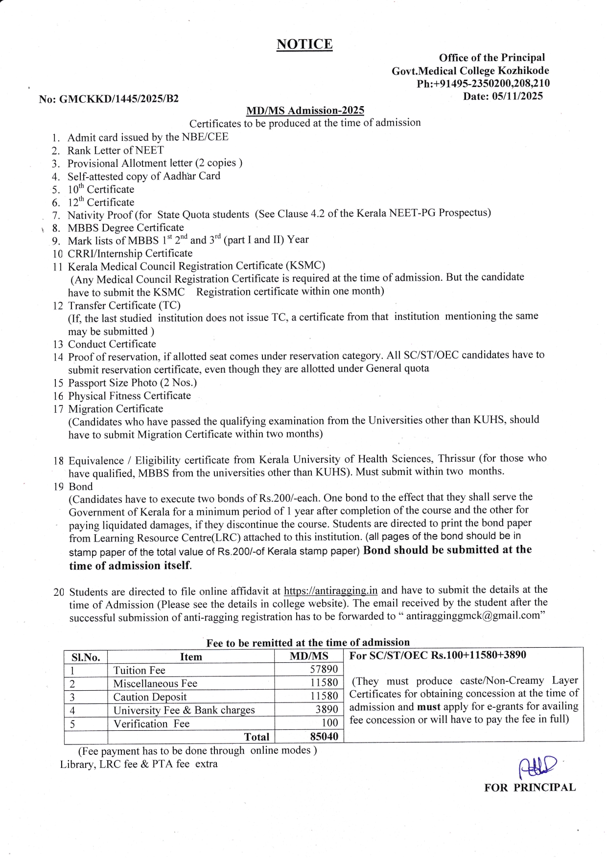 MD/MS Admission Notice 2025